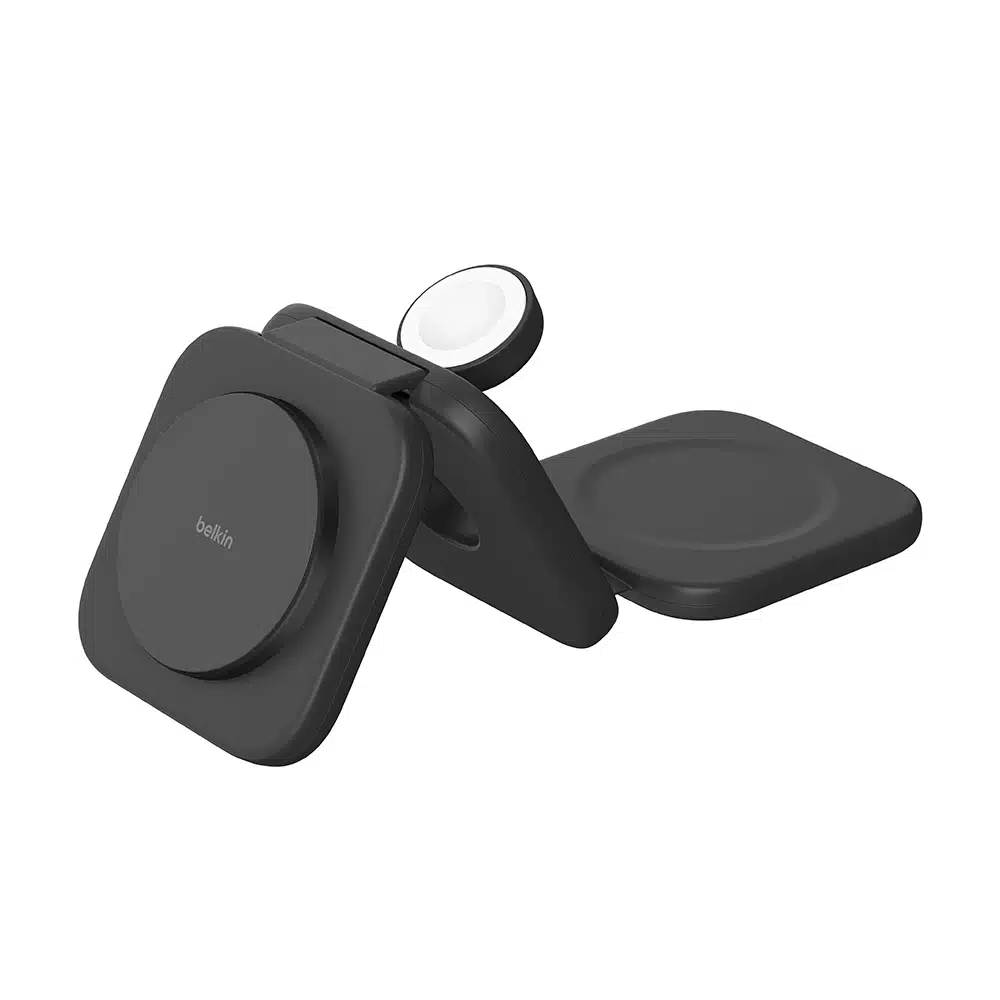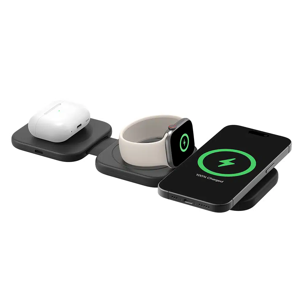 使用超方便的可摺疊攜帶式支架,為您日常所需的裝置充電。支架可為 iPhone 提供 15W 快速無線充電功率,以及為 Apple Watch 和 AirPods 提供 5W 充電功率。運用 Qi2 技術,只要將 iPhone 放置於與 MagSafe 兼容的充電板上,就能確保裝置一拍即合。