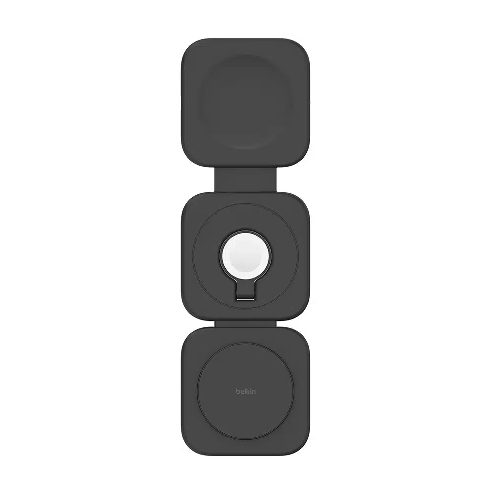 - 使用超方便的可摺疊攜帶式支架,為您日常所需的裝置充電。支架可為 iPhone 提供 15W 快速無線充電功率,以及為 Apple Watch 和 AirPods 提供 5W 充電功率。運用 Qi2 技術,只要將 iPhone 放置於充電板上,就能確保裝置一拍即合。