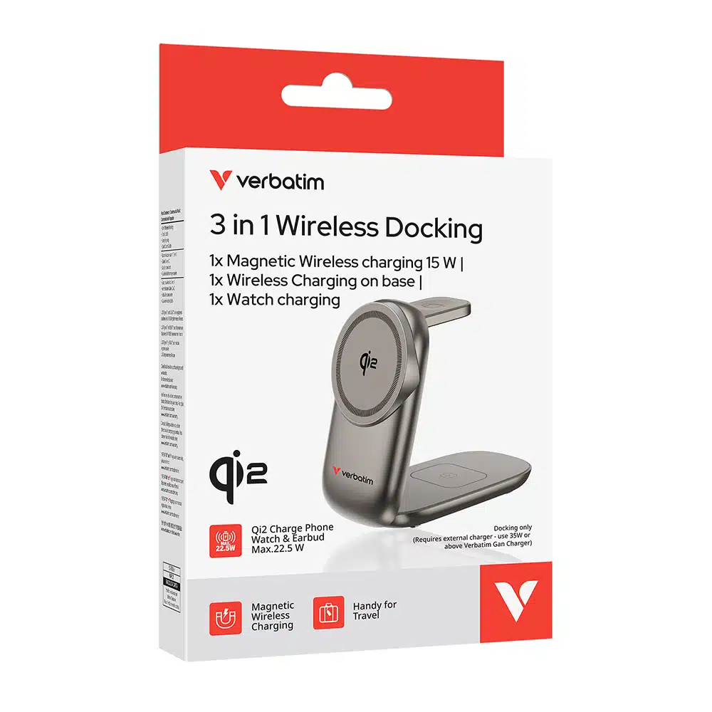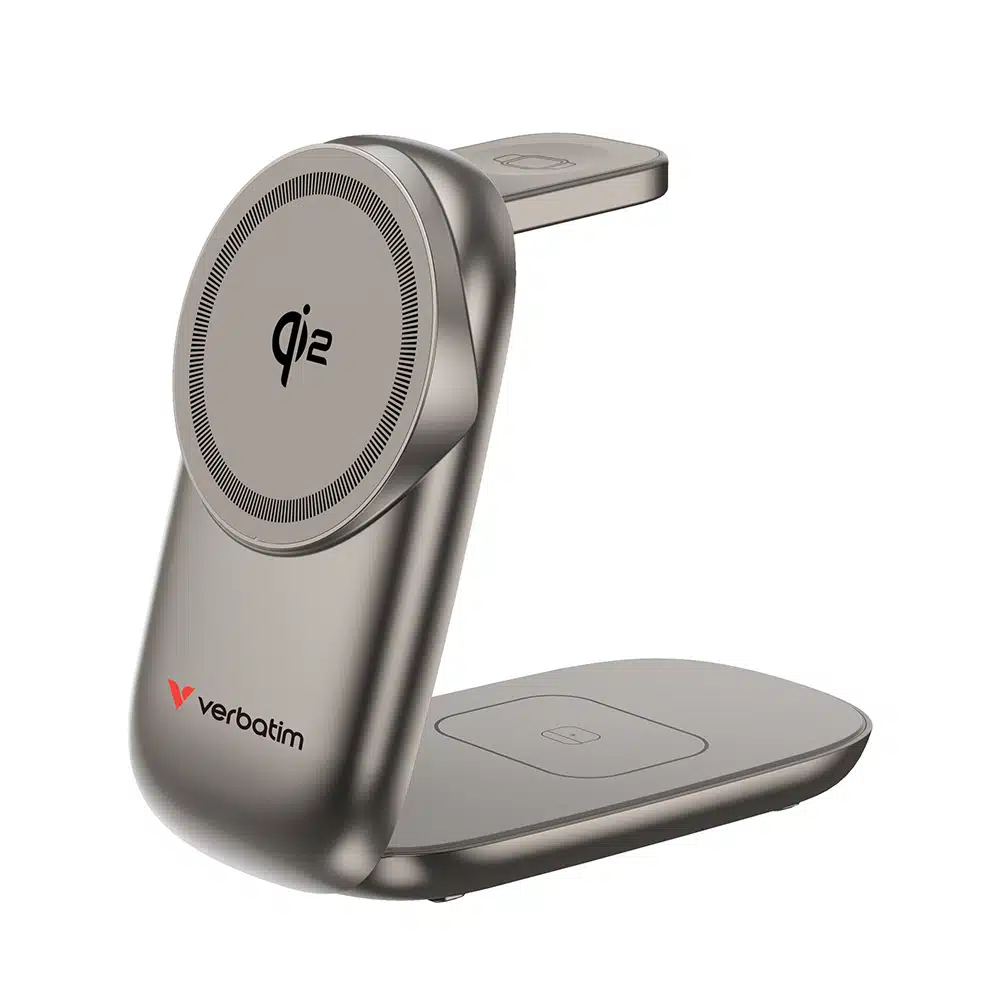 使用 Verbatim 三合一 Qi2 無線充電底座,簡化您的充電設定。這款多功能底座可同時為您的手機、手錶和耳機充電,告別雜亂的線材。總輸出功率高達 22.5W,提供快速可靠的充電體驗,讓您的裝置隨時可用。