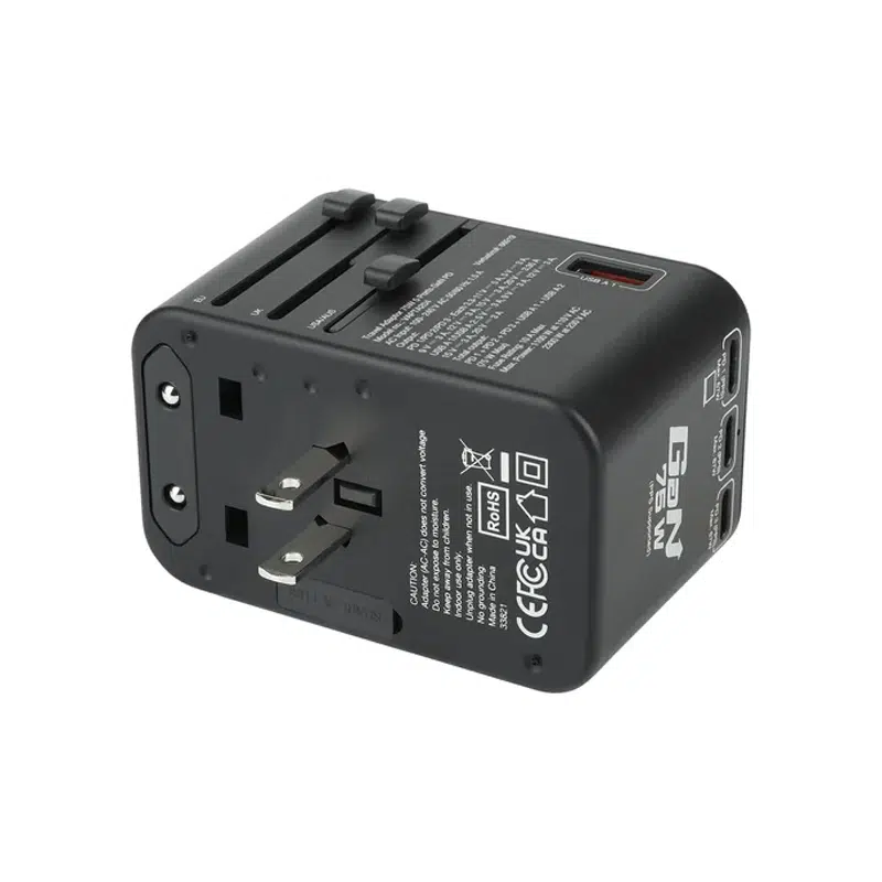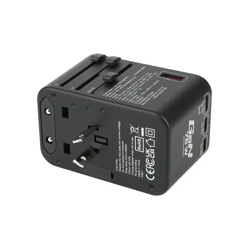 旅行充電器採用伸縮插頭設計,內置4款國際通用的轉換插頭,包括歐規、英規、美規及澳規,適用於150多個國家的插座。配備寬電壓AC國際插孔,可支援所有AC插頭*,包括MacBook Pro、Switch原裝充電器,即時當作國際轉插使用。